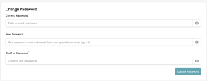 It is always recommended to update your password from time to time for your security and safety. Simply access the Password tab, enter your current and new passwords, and click ‘Update Password’ to secure them.