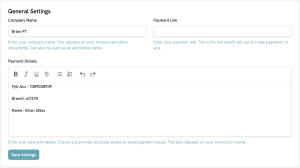 This tab is pivotal to ensuring a seamless and friction-free invoicing process. Rather than manually adding your account information, simply enter the relevant payment link and/or payment information here, and it will be automatically added to your invoices.